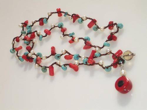 A vibrant mix of fresh-water pearls, red coral and turquoise beads on strong brown silk thread.