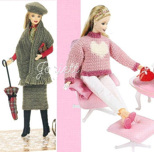 Perky Plaid, a plaid skirt and pullover sweater - Style Setter, fur-trimmed cardigan - Height of Luxury, mid-calf length coat with fur-trimmed hood and sleeves, with a matching scarf - Vive La France, skirt, top and beret - Bahama Top, Hat and Bag, halter top, wide-brimmed hat and purse - Sumptuous Luxury, evening gown of metallic yarn with a ruched bodice and bead accents, stole of fur yarn - "Fur" Frenzy, faux-fur car coat - Pop Art, striped hat and long V-neck vest of sparking yarn - Highland Ensemble, pocketed shawl and long skirt, matching tam - Springtime Wedding Florals: Sleeveless V-neck dress with ruffled neck, matching hat; frothy tulle train with crocheted flowers; pastel bridesmaid dresses; bouquet; - Rich Raspberry Ripple Afghan - Dutch Treat, granny square afghan and pillow set; bedspread -Posh Pinwheel Rug - Sweet Hearts, heart-shaped pillows - Fun in the Sun Beachwear: striped bikini, color block baggies, tropical trunks for Ken, red bikini, tank top for Barbie, beach coverup - Be My Valentine, pullover sweater - Festive Holiday Dress-Ups, Santa suit for Ken and Barbie; Jolly Jack-o-Lantern sweater - Wedding Splendor, bride's gown with pearls, pillbox hat and train, bouquet - Classic Suite Ensemble, jacket, skirt, shoulder bag and pillbox hat - Five Easy Pieces, jacket, skirt, pants, camisole, shoulder bag - Cozy Country Casuals, anorak with hood, buffalo plaid jacket, hat, dog coat - Sunday in the Park, basketweave pullover, granny stripe poncho - Symphony of Color, pullover and skirt - Country Squire, shawl collar pocketed cardigan for Ken - Terrific Terry Robe, robe with sash tie - Santa Fe Style, southwest striped jacket - Classic Camel Coat, mid-calf length coat with tie belt - Winter's Eve, mid-calf length sleeveless gown with shawl - Autumn Splendor, pullover and wrap skirt - Afternoon Tea, sheath dress and hat, stylized stripes dress and hat - Sleek Sophistication, coat dress - Haute Couture, cowl collar sweater - Granny Square Update, cropped top and skirt of granny squares - Glamorous Crisscross Silhouette, evening dress of metallic yarn, stole - Bags For All Occasions, backpack, string bag, and mesh tote - Fashionable Hat Sets, "fur" hat and bag, jute hat and bag - Cold Weather Accoutrements, warm'n tweedy hat, pull through scarf, pompom hat and scarf - Hats For All Occasions, ruby bowler, tam-o-shanter, cute cloche, picture hat, and beaded hat - Ballerina Dream Surplice, criss-cross sweater that wraps in front and ties in back - Patriotic Pullovers, yankee doodle polo pullover, star spangled crop top, stars'n'stripes pullover - Flirty Mini, minidress and hat - Night Song Radiance, strapless evening top and matching scarf - Picadilly Plaid, pullover sweater and skirt - Budding Beauty, dress and belt