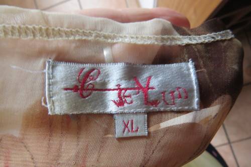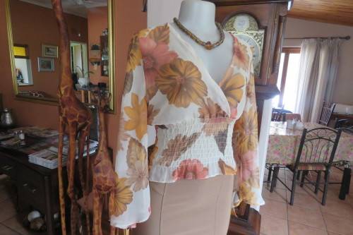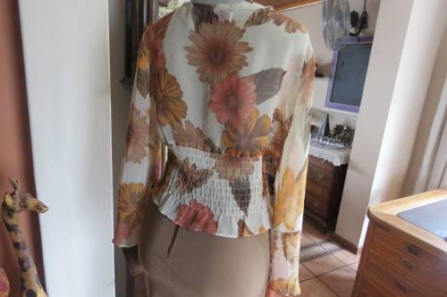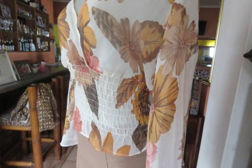 Cropped cream polyester cross over top with bold brick and coral Flowers. Size 42/18. By 'C it Yud'. With wide elasticated waist. Wide open top sleeves. Wear over cami. Good condition.