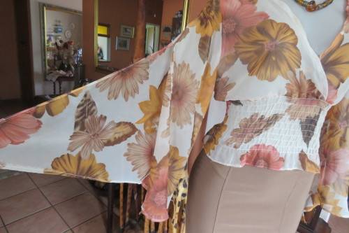 Cropped cream polyester cross over top with bold brick and coral Flowers. Size 42/18.