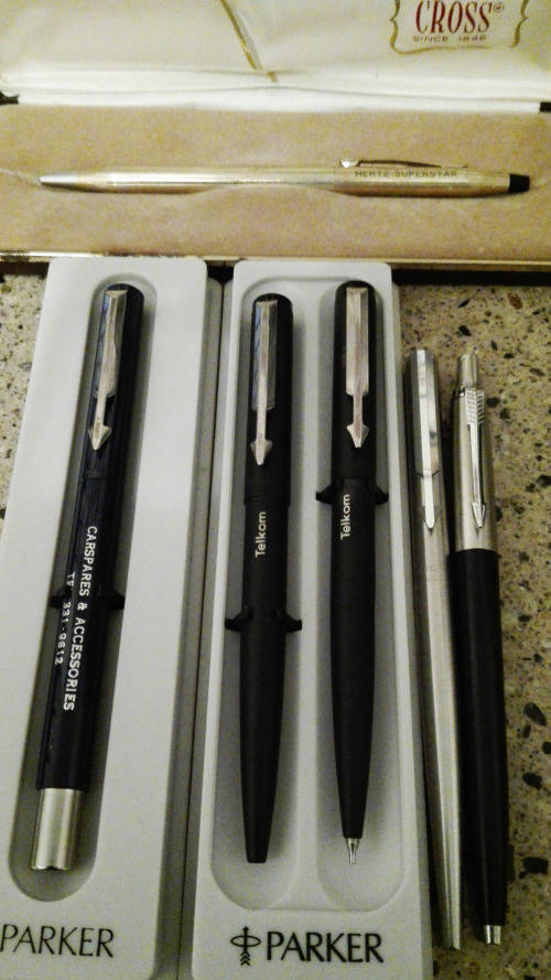 THERE IS ONE PARKER PENCIL AND ONE CROSS PEN, ROLLED GOLD 10CT, MADE IN IRELAND AND FOUR PARKER PENS. ALL CAN BE MADE TO WRITE, SOME REFILLS HAVE TO BE REPLACED.