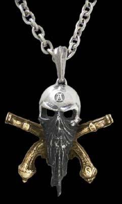 Crest of the famed highwayman, William Spencer, d.1729, aged 31. In a subtle tri-tone, polished skull, black mask and antique gold pistols.