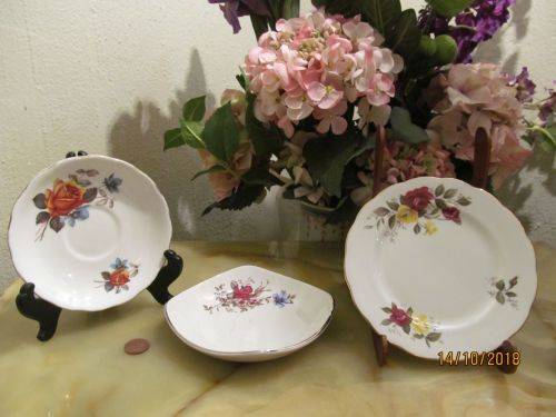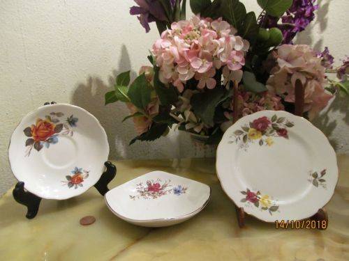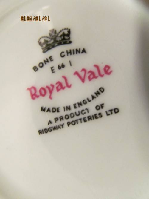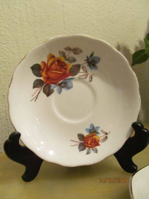 1)- A ROYAL VALE BONE CHINA SAUCER WITH SCALLOPED RIM AND GOLD TRIM. THE ITEM IS DECORATED WITH A DEEP ORANGE AND AQUA BLUE ROSE PATTERN ALONG WITH TAN LEAVES. ROYAL VALE IS A TRADE NAME USED BY H.J COLCLOUGH WHICH RECEIVED ROYAL LICENSE IN 1913. TODAY THE PRODUCER IS PART OF THE RIDGWAY GROUP. THIS SAUCER HAS SLIGHT FADING ON THE GOLD TRIM BUT IS OTHERWISE IN PERFECT CONDITION WITH NO CRAZING, CHIPS, CRACKS, DAMAGES ETC. THE ITEM IS STAMPED UNDERNEATH - "BONE CHINA E 66 I, ROYAL VALE, MADE IN ENGLAND, A PRODUCT OF RIDGWAY POTTERIES LTD" THE ITEM IS 2.4cm HEIGHT.....4.4cm DIAMETER OF BASE.....14cm DIAMETER OF RIM