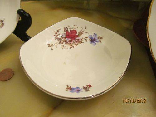 2)- A 1950's FINE PORCELAIN SQUARED SWEETS / BON BON DISH WITH RAISED CORNERS AND PLATINUM TRIM. THE ITEM IS MANUFACTURED BY ROYAL WINTON GRIMWADES. THE DISH IS DECORATED WITH A DEEP BLUE, SCARLET RED, SOFT PINK AND TAN FLORAL PATTERN. THE ITEM HAS AGE RELATED CRAZING UNDERNEATH, ASIDE FROM WHICH IT IS IN PERFECT CONDITION WITH NO CHIPS, CRACKS, DAMAGES ETC. THE DISH IS STAMPED UNDERNEATH - "ROYAL WINTON, GRIMWADES, ENGLAND" IT IS 2.6cm HEIGHT.....8cm DIAMETER OF BASE.....14cm ACROSS RIM