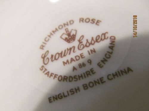 3)- A CROWN ESSEX BONE CHINA TEA PLATE MANUFACTURED IN STAFFORDSHIRE. THE TEA PLATE HAS A GOLD TRIM SCALLOPED RIM AND IS DECORATED IN THE "RICHMOND ROSE" PATTERN WHICH DISPLAYS BRILLIANT SCARLET RED AND BRIGHT YELLOW ROSES WITH LEAVES AND SPRIGS. IN PERFECT CONDITION WITH NO CRAZING, CHIPS, CRACKS, DAMAGES ETC. THE TEA PLATE IS STAMPED UNDERNEATH - "RICHMOND ROSE, CROWN ESSEX, MADE IN STAFFORDSHIRE ENGLAND, A 86 9, ENGLISH BONE CHINA. IT IS 1.2cm HEIGHT.....9.5cm DIAMETER OF BASE.....16.2cm DIAMETER OF RIM