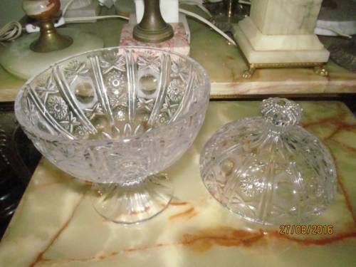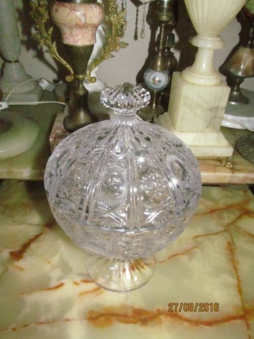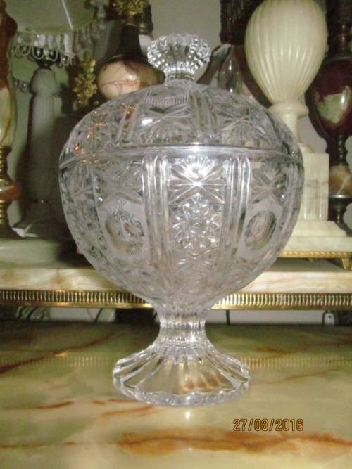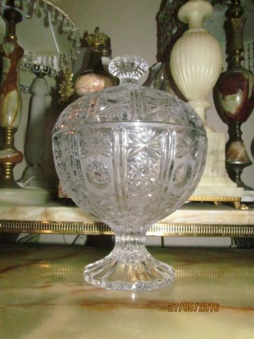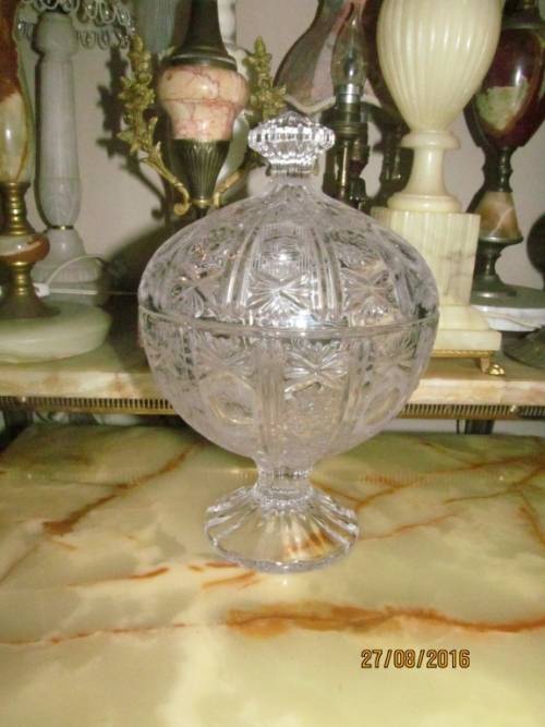 VINTAGE Lead Crystal Compote Candy Dish on Pedestal Stand Extensively Decorated with Starburst and Floral Cut Pattern. Lid has a WONDERFUL Diamond Cut Handle