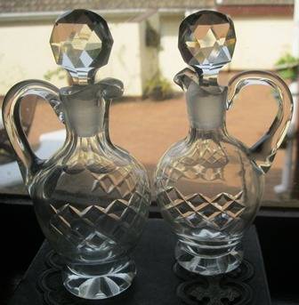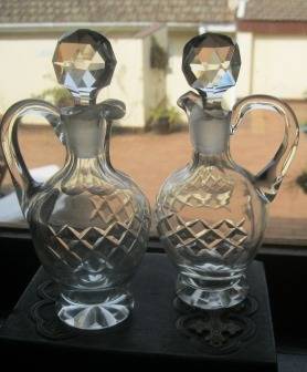 A Beautiful set of crystal Vinegar & Oil Decanters with very nice stoppers in mint condition, no chips or cracks!