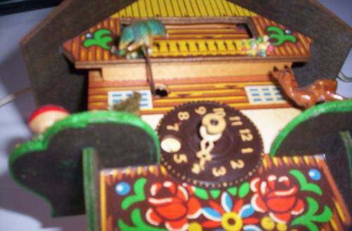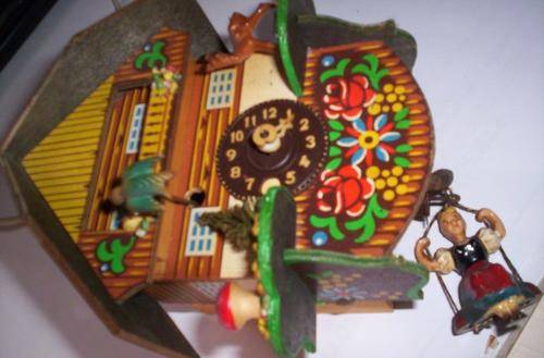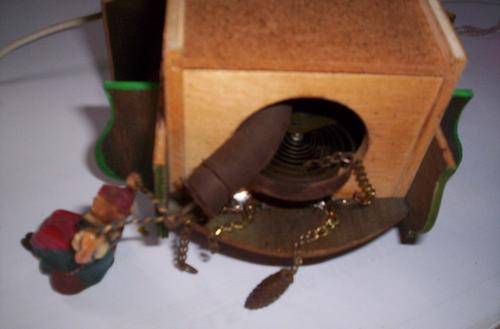 THIS IS A SMALL WALL CLOCK GERMAN MAKE. NOT WORKING. SPRING BROKEN, ONE HAND MISSING AS WELL AS ONE OF THE SMALL WEGHTS. SELL AS PARTS ONLY. THIS PIECE IS NOT THE CLEANEST, I REFUSE TO CLEAN IT BECAUSE OF FURTHER AMAGE AS IS