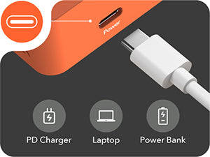 Power it with your laptop or phone charger through the USB-C Power Jack. The third-party power supply needs to be 5V / 2A or equipping PD.