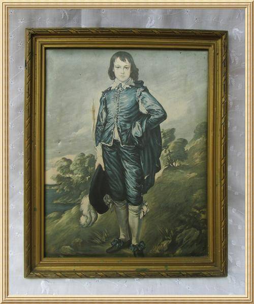 A lovely cushion framed " Blue boy ", size 22.5cm x 27.5cm, with tear.