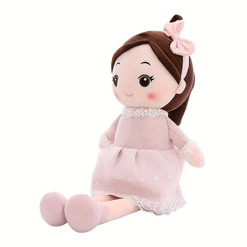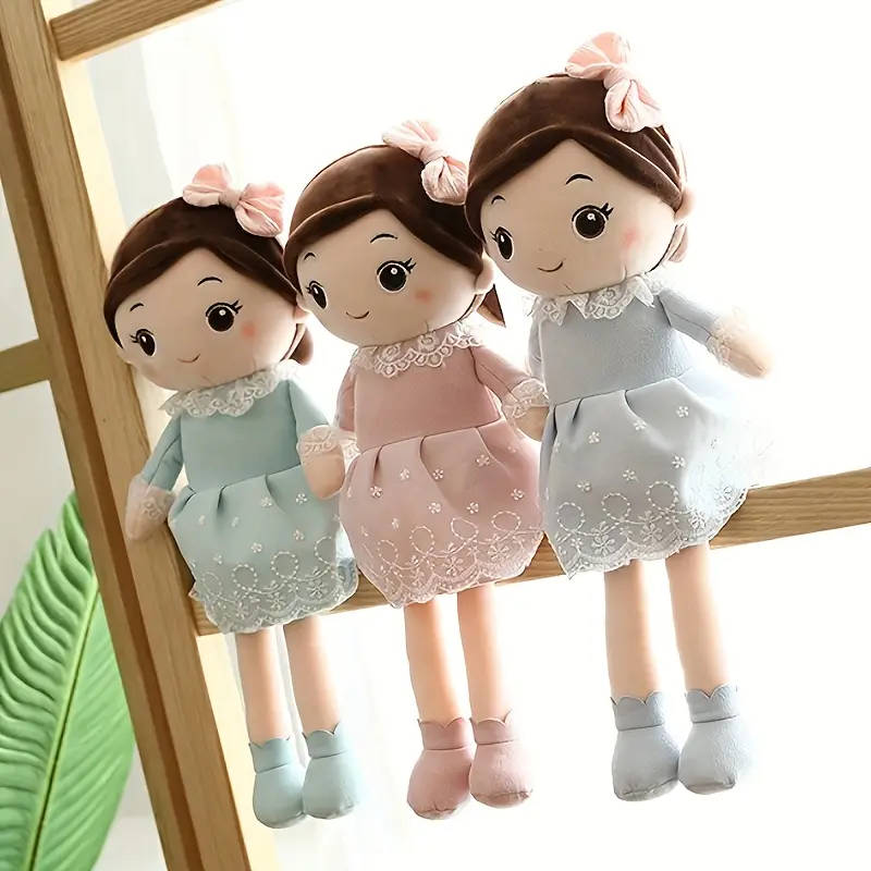 Cute cartoon little girl plush toy - a soft, huggable pillow with lively eyes and a charming smile. Paired with a light pink/green lace skirt and a bow hairpin, this toy makes a great birthday party decoration, room decor, or gift for girls (durable and soft material).