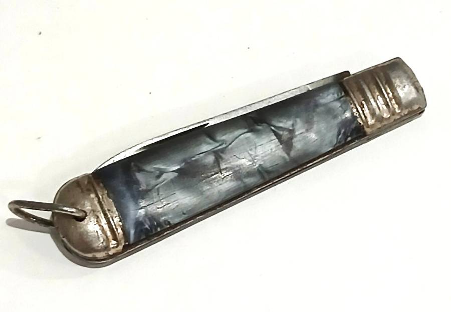 Add a touch of vintage charm to your collection with this lovely fruit knife, measuring a compact 9cm x 0.5cm x 2cm when closed. Crafted in Czechoslovakia, this piece features a sleek, silver-tone metal body (not sterling silver) accented with faux mother of pearl scales, giving it an elegant yet practical appeal.