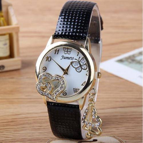 Cute Ladies Black Leather Heart Pendant Wrist Watch - Erkek Saat