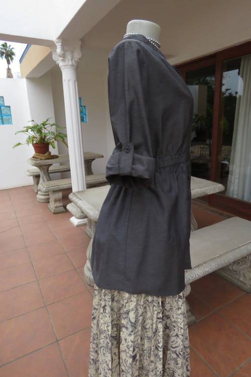 Cute long grey top by MILADY'S in size 36/12 with yoke and gathering.High banded collar and V front with button down front.Elasticated waist.Tiestring at back.In polycotton fabric.As new.