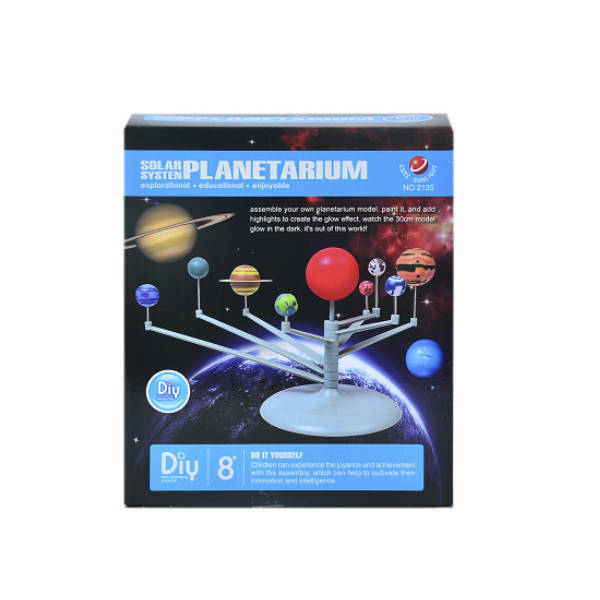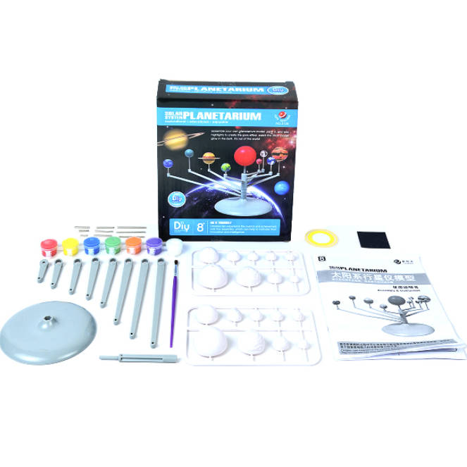 Cute Sunlight DIY Solar System With English Instruction Description: Size: 32*12cm Material: Plastic Kits: 1 ×Stripe of paint pots 1 ×Brush 1 ×Sustain circumgyrate seat 1 ×Sustain arm 8 ×Circumgyrate arm 1 ×Sand paper 1 ×Saturn ring template 9 ×Steel bars Package Included: 1 × DIY Solar System 1 × English Instruction