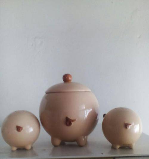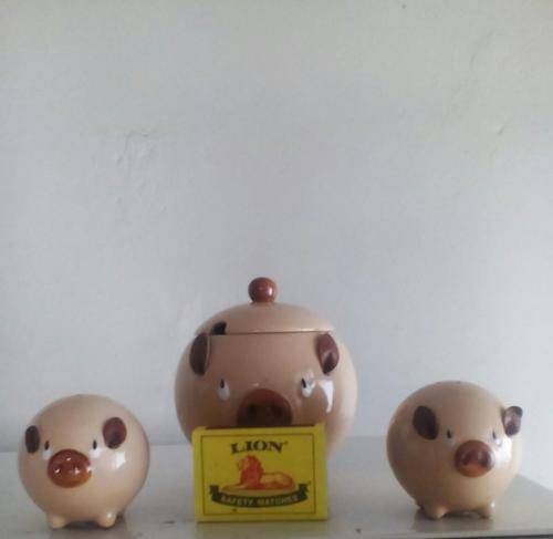 Dearest set of three ceramic piggies cruel set. Consists of salt and pepper shakers and a sugar/jam pot. Unmarked. Excellent condition.