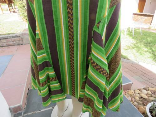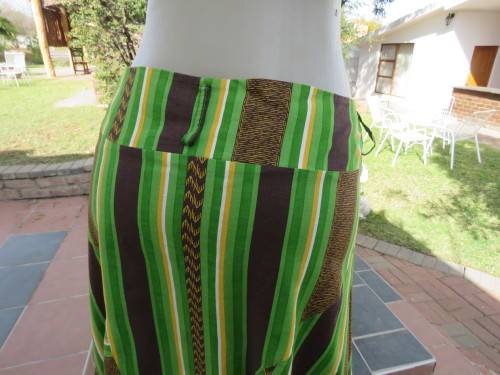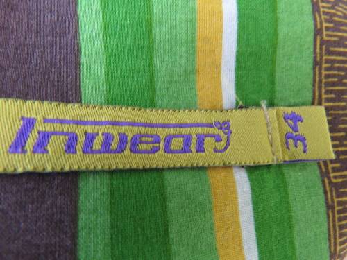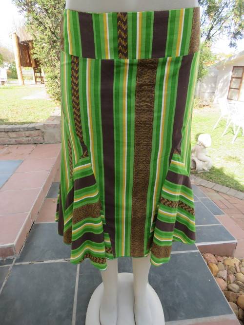 Cutting-edge kick-out fully lined skirt by 'INWEAR' in size 34/10.In 100% cotton fabric.In green,yellow,white and brown stripes vertical patterned stripes.Wide waistband with belt loops.Zip at side.As new.