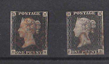 CV++R4 500.00 4 tight margined penny black with red MC cancellation + 1 Damaged one (Letters FB is damaged, a crease running right through the stamp. This is thrown in together with the 4 tight margins DH. The penny Black has gone up almost R1000.00 in catalogue value in the last year.
