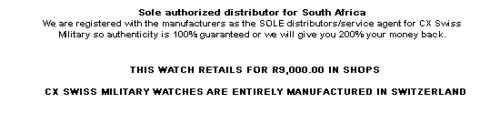 PLEASE CLICK ON THE LINK TO SEE MY OTHER CX SWISS MILITARY AUCTIONS: http://www.bidorbuy.co.za/seller/312639/swissluxury