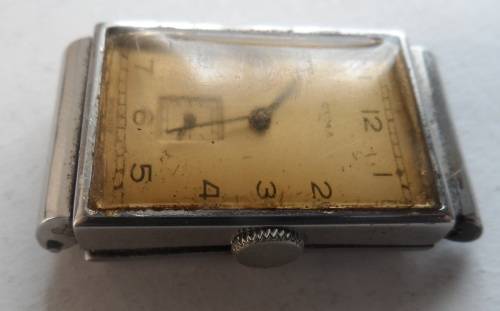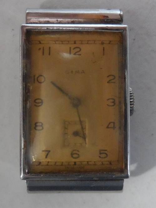 Cyma Manual Wrist Watch. Not running, for spares/repairs, parts might be missing? No strap. Watch has some wear/marks/scratches. Crown rotates, hands move. Movement marked: Cyma Swiss Made 15 Jewels Patented. Case cover engraved. Lug on one end of the case is damaged. Size: +-35mm x 20mm.