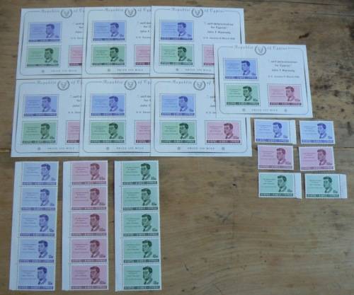 Cyprus 1964 Kennedy 6 MNH stamps + 3 strips of 5 (folded) + 7 minisheets