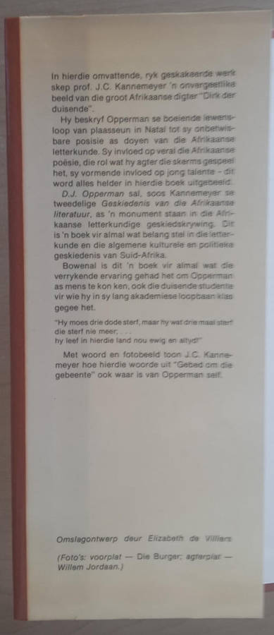 "In hierdie omvattende, ryk geskakeerde werk skep prof. J.C. Kannemeyer 'n onvergeetlike beeld van die groot Afrikaanse digter. "Dirk der duisende". D.J. Opperman: "n Biografie sal, soos Kannemeyer se tweedelige Geskiedenis van die Afrikaanse Literatuur, as 'n monument staan in die Afrikaanse letterkundige geskiedskrywing."
