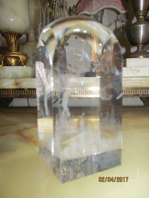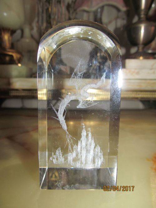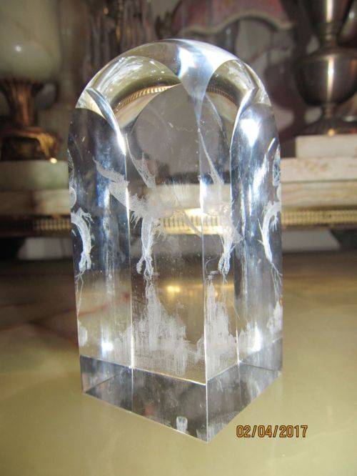 ALTHOUGH THESE SOLID GLASS ITEMS HAVE BECOME A RATHER COMMON OCCURRENCE IN SA, EVERY NOW AND THEN ONE APPEARS THAT MANAGES TO FASCINATE SIMPLY BY THE BEAUTY AND/OR SIGNIFICANCE OF THE IMAGE EMBEDDED WITHIN. THIS GLASS ITEM IS SQUARE SHAPED WITH A DOMED TOP AND RATHER HEAVY. THE IMAGE WITHIN IS THAT OF A LARGE DRAGON BLASTING FLAMES ONTO A CASTLE BELOW AS IT FLIES WITH WINGS OUTSTRETCHED SUSPENDED IN THE AIR ABOVE --- ECHOS OF "GAME OF THRONES" AND DAENERYS STORMBORN (KHALEESI) AND HER PETS :) :)