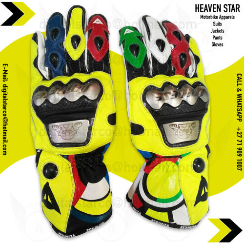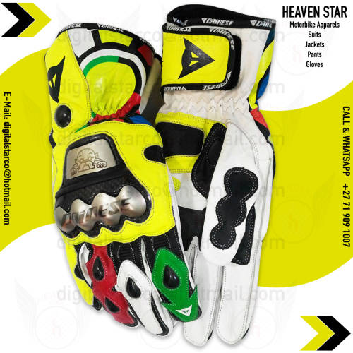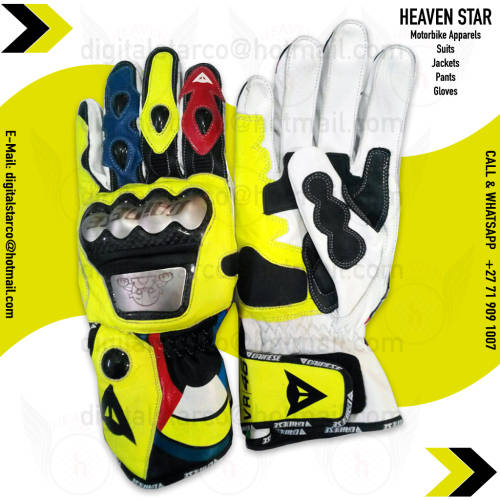 Dainese Motorbike Racing Leather Gloves is especially designed for professional bikers to fulfill their biking passion on track with great safety. This gloves features excellent design & comfort, 100% genuine Cowhide leather. Long gauntlet-style leather glove for complete coverage, Injection molded polycarbonate knuckle for impact and abrasion resistance, Open back knuckle design for added flexibility, Vented finger protection with additional thumb protection, Premium leather palm with reinforced padding, Pr-curved leather finger sidewall, Wrist and gauntlet closures for added safety & Drum dyed leather top quality cow hide leather.Available in sizes All Size for Men's & Women's.