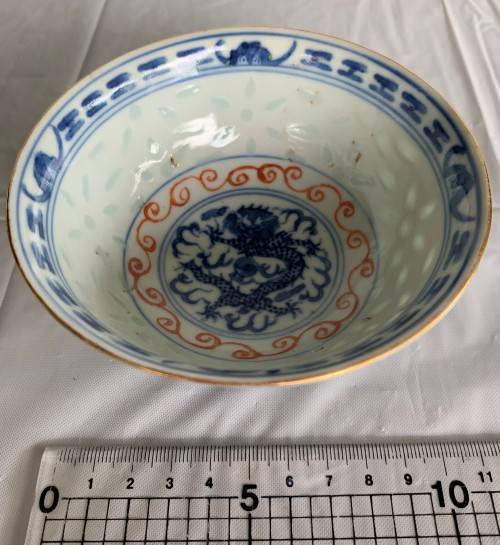THIS IS A PRETTY TRANSLUCENT RICE EYE DISH DECORATED WITH FLOWERS AND GOLD TRIM. THE INSIDE OF THE BOWL HAS A DRAGON MOTIF.ON THE BOTTOM OF THE BOWL IT HAS WRITING.
