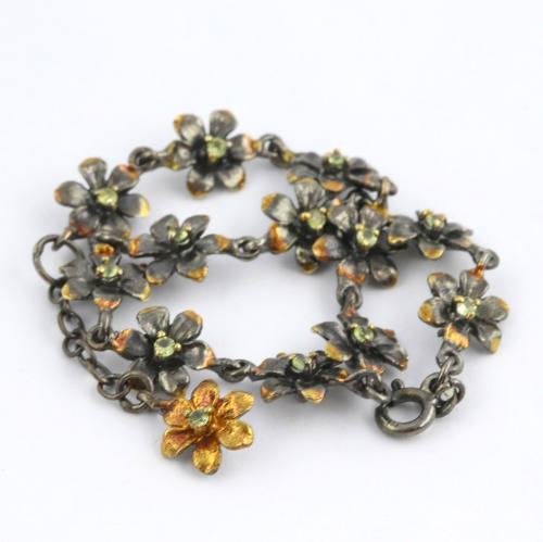 This unusual piece is crafted in sterling silver with a gunmetal finish, created by a individual flowers on each link, with a central round cut peridot held on extended claws. Interest is added with dabs of rose gold gild on each petal. The bracelet measures 7,5mm wide x 18,5 cm (185mm) long with a 30mm extender chain that ends in a single rose gold-hued flower as a decorative element. The piece weighs a solid 12 grams and bears the 925 hallmark indicating sterling silver. There is an appealing Bohemian/Goth feel to the bracelet.