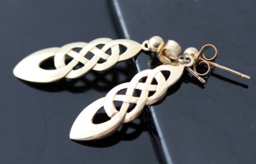 These earrings are simple and elegant, classic. A true Celtic knot design, the drops are 30mm in length and 8mm wide, hanging on a simple stud. The 9ct yellow gold dangle is slim in profile; a smooth shine on the one side and a beaten texture in reverse, very light and comfortable on the ear. The loops end in a pointed feature both top and bottom, the bottom loop being longer and wider. It's a classic Celtic knot design that loops without obvious ending, representative of infinity. The designer uses only one "thread" of gold to represent how life and eternity are connected! The 9ct hallmark indicating genuine 9 carat gold appears on the butterfly that holds the stud firmly in the ear. Subtle rather than showy and by no means a heavy chunky piece but rather special in meaning, these earrings are different, simple and classy. There are no jeweller signatures on the earrings. All I can tell you is that I bought them in a vintage jeweller in London, England.