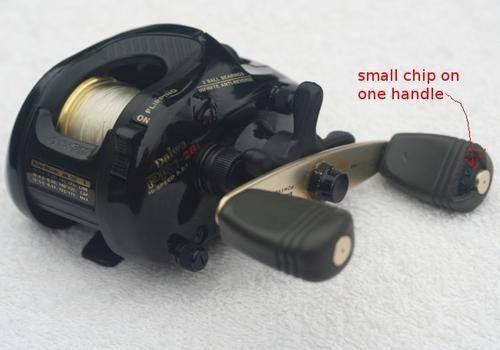 Please note: One of the rubber handles has a piece of rubber that's chipped but this in no way affects the operation of the handle or reel. See actual picture below.
