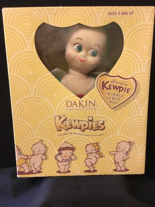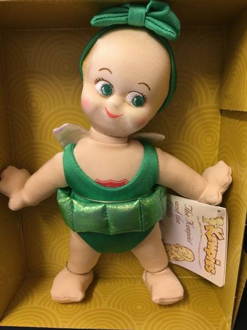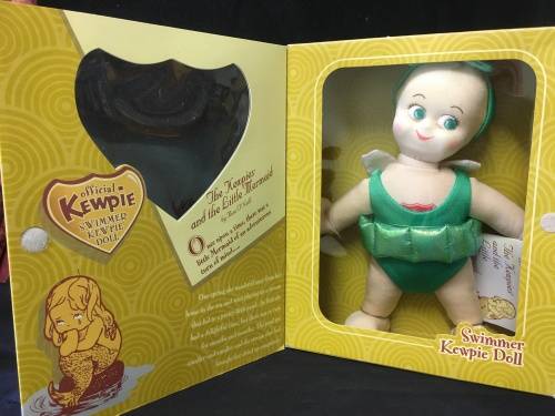 'Kewpies are the kind-hearted, "jolliest little band of good-cheerers ever imagined." An instant classic since their creation in 1909 by artist Rose O'Neill, Kewpies have spread love and laughter across generations through the inspired stories of their good deeds.The Dakin Signature Collections continues a tradition of inspired collectables through their presentation of Kewpies.This is the soft plush swimmer Kewpie. She is about 24cm from head to toe and in very good condition. She has wings on her back. Included with her is a little storybook about the Kewpies and the Little Mermaid.