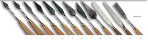 A range of high quality painting knives in a selection of 12 shapes. All knives feature highly flexible steel bladed and wooden handles.