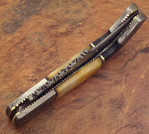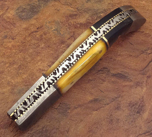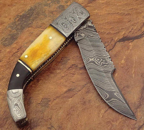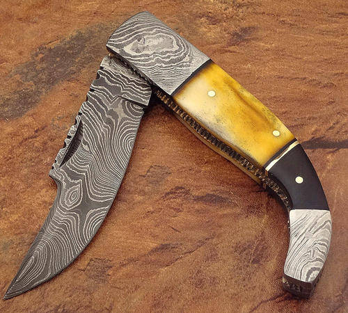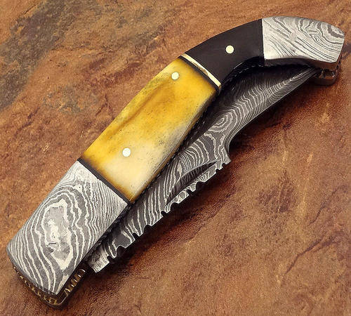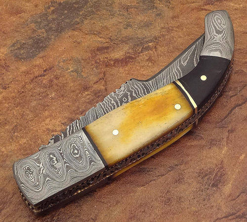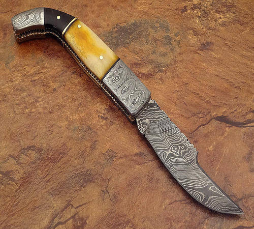 DAMASCUS STEEL HUNTING KNIFE WITH YELLOW CAMEL BONE AND BUFFALO HORN HANDLE