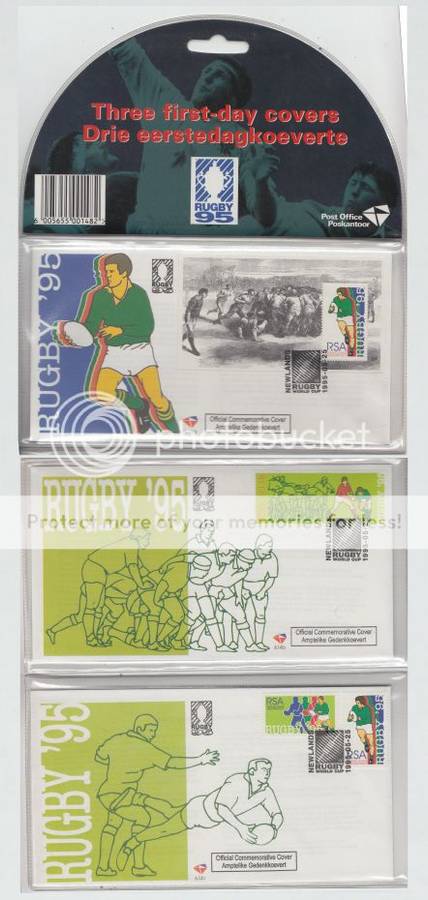 The winning bidder will also receive as a bonus this set of three First Day Covers issued by the South African Post Office for the Rugby World Cup of 1995.