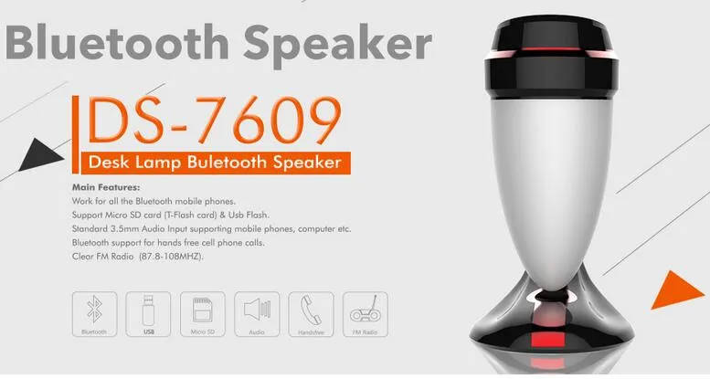Original Bluetooth Speaker DS-7609 5W High Power LED Colorful Atmosphere Lights Desk Lamp FM Luxury Household Articles Hands-free Call SubwooferDaniel DANIU DS-7609 new portable handsfree Bluetooth speaker 5W high power LED colorful atmosphere lightsLight Bluetooth Speaker, LED Desk Lamp Night Portable Bluetooth Speaker, Indoor Lamp Wireless Speaker with 5W Output, 2000mAh Long Playback Time Home Bluetooth Stereo SpeakerDANIU HiFi Cup Table lamp Bluetooth speaker Support FM radio USB/TF card MP3 Player LED Colorful Mood Light Desktop Hands-free Micphone Bass loudspeakerWireless Bluetooth Desk Lamp Speaker with Bright Led LightFunction description:LED Colorful Atmosphere lampBuilt-in bluetooth wireless transmission, telephone hands-free functionStereo audio transmission protocol (A2DP V1.2)Support MP3 songs play U disk storageSupport MP3 songs played TF card storeSupport all external terminal 3.5 mm audio inputSupport FM channel automaticallySupport it can be charging circuitProduct parameters:Bluetooth version: Jieli 3.0Output power: 5 W * 1The input sensitivity: 400 mvDegrees of separation:≥ 90 dbSignal to noise ratio: ≥80dbWorking voltage: DC 5 vBattery capacity: 2000 mahPacking with original gift box