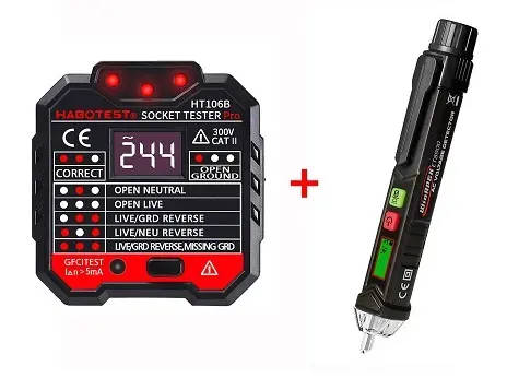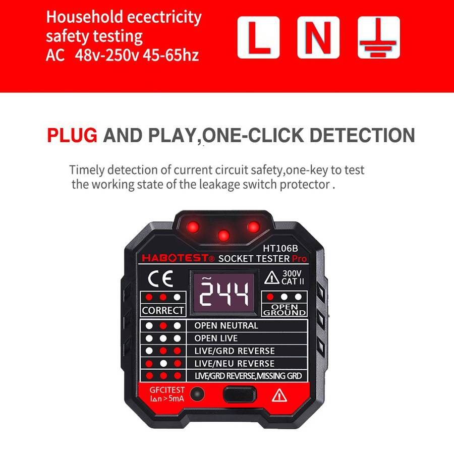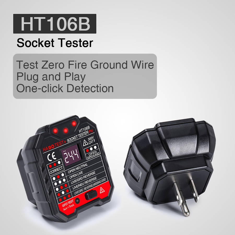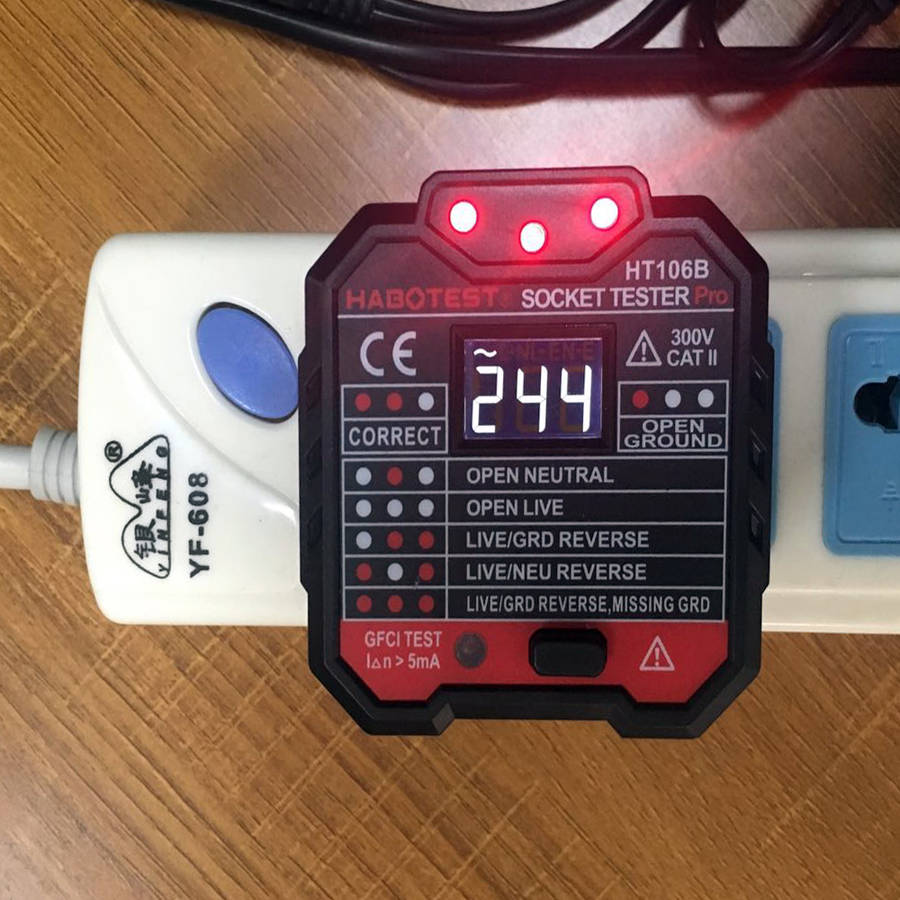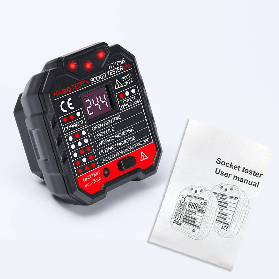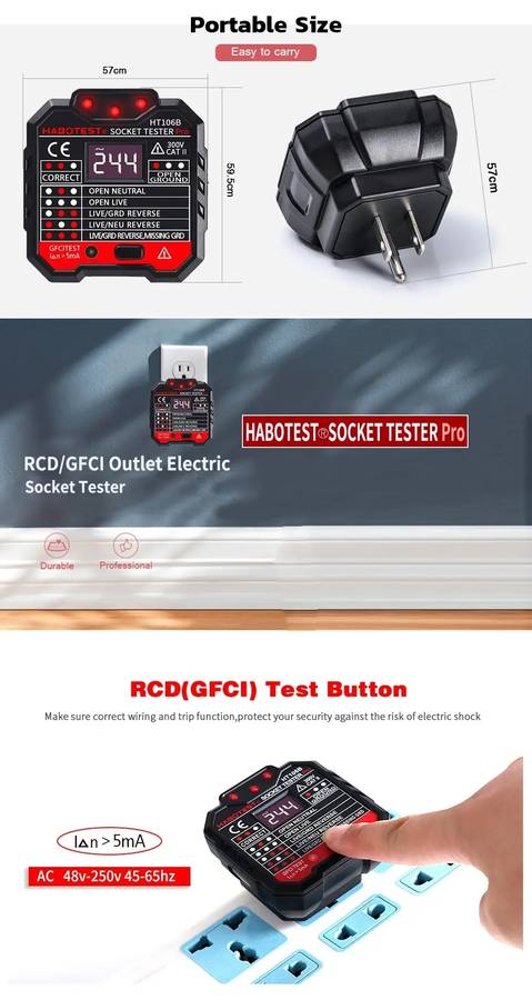 Descriptions: Socket tester is mainly used for power socket wiring detection and RCD test. It can detect the wiring status of the socket quickly and accurately. With LCD, it can also measure the voltage of the socket and display it. Features: a| operating voltage: 48~250V/45~65Hz a|Measure voltage (with LCD): 48~250V/45~65Hz a|accuracy:± (2.0%+2) a|operating temperature: 0ᆪC~40ᆪC a|operating Humidity: 20%~75%RH a|Storage temperature: -10ᆪC~50ᆪC a|Storage Humidity: 20%~80%RH a|Altitude: a2000m a|RCD test: >30mA a|RCD working voltage: 220V±20V a|GFCI test: >5mA a|GFCI working voltage: 110V±20V