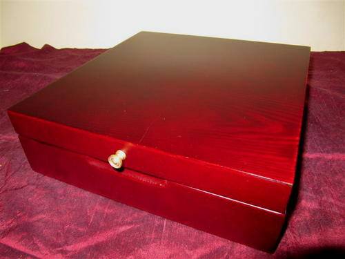 A lovely cutlery canteen in a dark cherry coloured wood. Lined with a black satin inside, to hold a set of cutlery. Can also be used as a trinket box! A minor scratch is visible on the top - see photos! Dimensions: 27 cm x 26 cm x 8 cm.