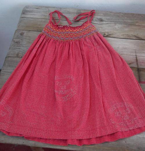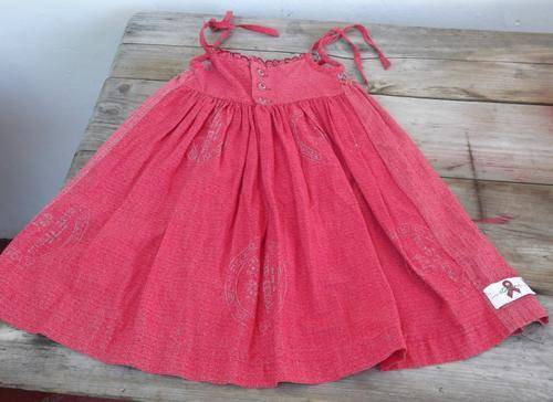 Does not have any labels on inside, but should fit a little girl of 6 years, beautiful smocking detail, adjustable straps, pretty button detail on back