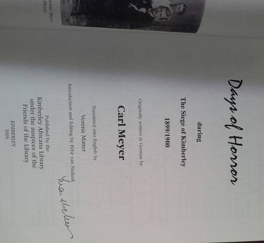 Item Description: Kimberley Africana Library under the auspices of the Friends of the Library, Kimberley, 1999. Pictorial Wrappers. Book Condition: Very Good +. First Edition. Mini series No. 1. Originally published in German as "Der Schreckenstage von Kimberley 1899-1900". Translated into English by Verena Matter. Introduction and Editing done by Febe van Niekerk. SIGNED by Febe van Niekerk on the title-page. 98 pp. Some black and white illustrations within the text.Some light wear and creasing to the panels. "This remarkable diary covering the Siege of Kimberley and its aftermath was written by the German missionary, Carl Meyer. It is an important addition to the literature dealing with this historical event as it presents a unique insight into the effect of the war on social conditions of the time. Meyer, a politically neutral person, committed himself tirelessly not only to the welfare of his flock, but also to the fair treatment of all parties involved in the war, regardless of race or political affiliation. The reader is drawn into the everyday problems besetting the dedicated and selfless pastor, a man who never spared himself and in consequence passed away the day before the armstice of the South African Anglo-Boer War. It is a human interest story which will be enjoyed by the layman as well as the academic. The manuscript of the diary was sent to Germany in 1900 in the mailboat, Mexican, which was sunk. Fortunately the diary was salvaged from the mailbag in a poor but legible condition. Very few of the original printed copies have survived; one of these was donated to the Kimberley Africana Library by the council chairman of the German Lutheran Church in 1998". Size: Octavo. SIGNED. LIMITED EDITION. Bookseller Inventory # 05005