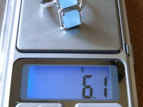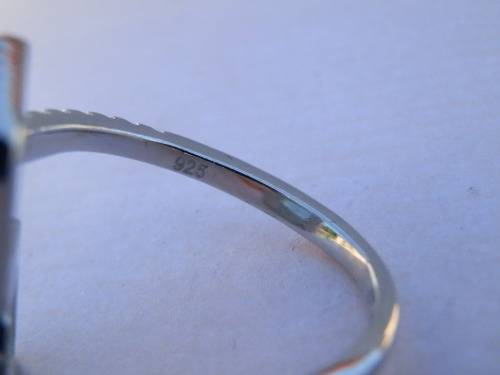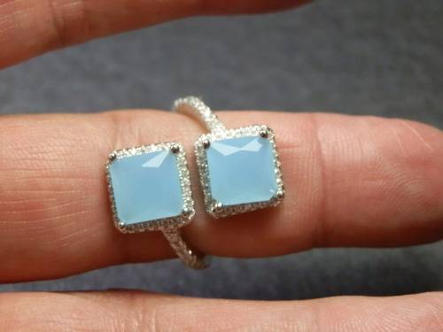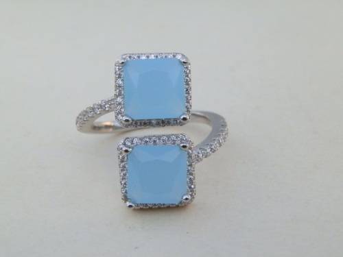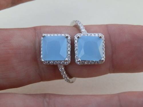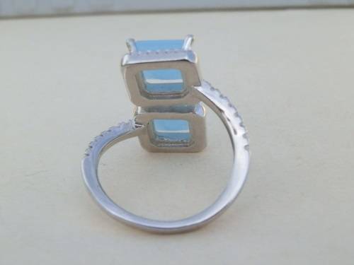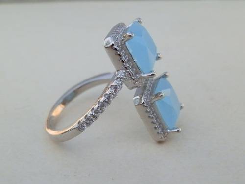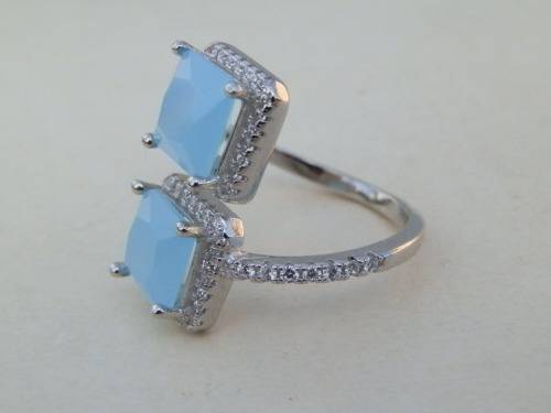 Fabulous sterling silver ring with two blue stones and clear accent stones, marked 925 and in good as new condition. The size is P / 8, top width 20 mm and the weight 6.1 g. The size of the blue stones is 8 x 8 mm each. Very nice!!