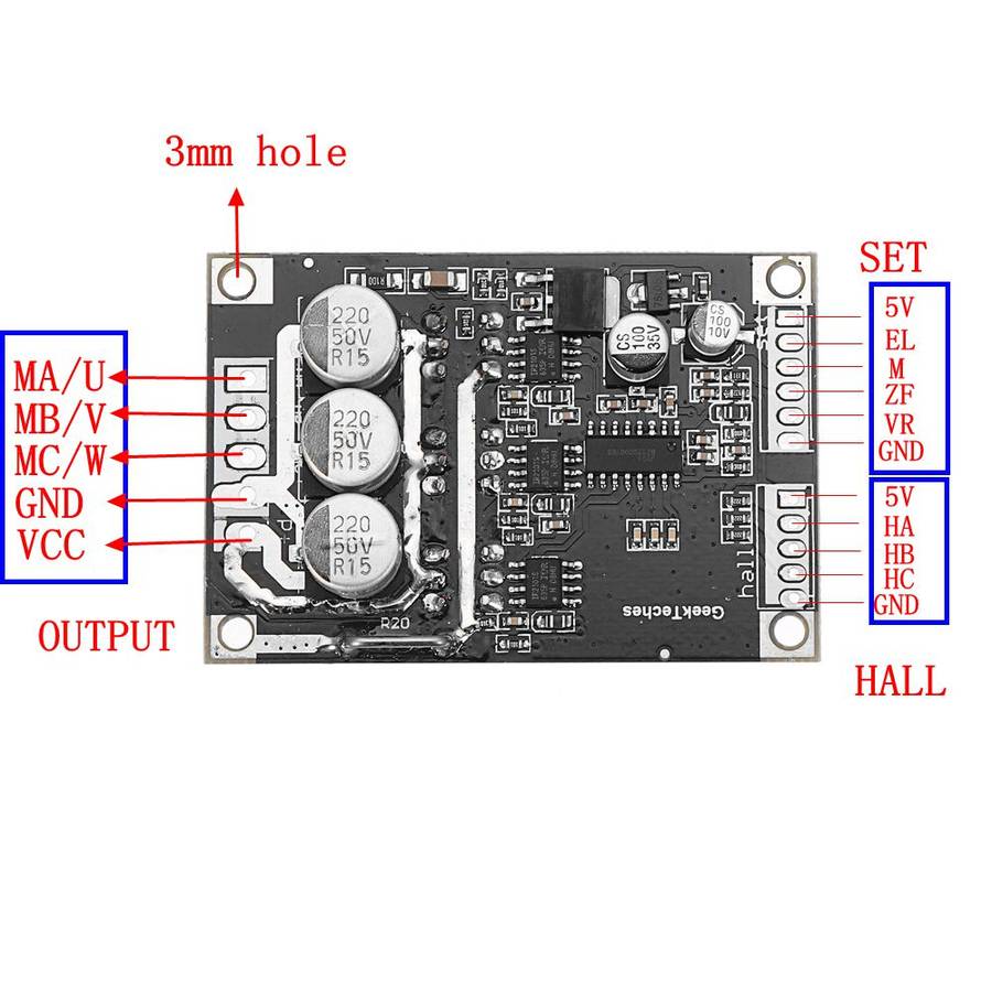 Note: Due to different motor manufacturers to make the hall of hall line order does not necessarily follow the line on the board to match the seque, need to be adjusted, please parents who pay attention! If the line seque wrong, does not boot properly, current, or start other phenomena not open, forced to use the drive plate will burn!!! Motor driver board 12-36V DC power input, VCC positive power supply,GND power supply is negative. Electrical wiring methods: Brushless DC motor for the three lines, corresponding MA/U, MB/V, MC/W