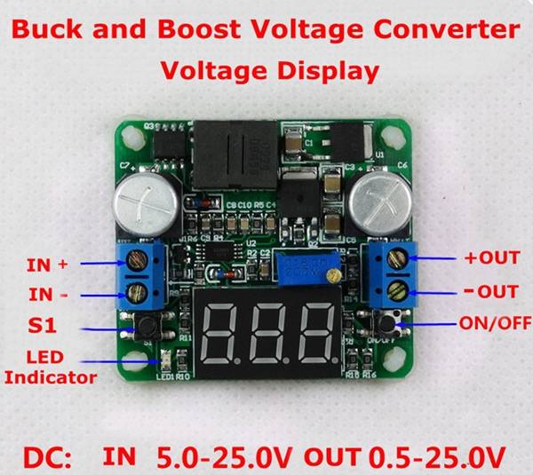 Package weight: 0.03 kg Specification: In+: Input positive In-: Input negative Out+: Output positive Out-: Output negative ON/0FF: Output control key S1: Mode select key / memory key Size: 47 x 41 x 16mm (L x W x H) Weight: 25g Input voltage: DC 5-25V LED Indicator: YES Output voltage: DC 0.5-25V(Adjustable) Continuous output current:2A(max) Continuous input current:2A(max) Input / output power:25W(max) Input / output current:The input / output current (Uin*Iin* efficiency =Uout*Iout) under rated conditions is calculated according to the conservation of power Features: 1. The input and output voltage can be alternately displayed. 2. Boot status can be defined freely. 3. With button switch machine function, easy to control the output. 4. High power MOS tube reverse connection protection circuit, improve work efficiency and reliability. Work pattern description: Input voltage mode: Boot default to input voltage mode, show * *.*LED indicator light, output closed. Output voltage mode: Press S1 to switch to the output voltage mode once, indicating that the **.*LED indicator goes out,If output is off, display 0FF. Alternate mode: Press the S1 input / output voltage alternately again, and the 3S turns to displayData (again, revert to the input voltage display mode) Memory model: Long press the S1 key above 2S, the module automatically remembers the current working state as the default boot state. The [0] stands for default to show the input voltage The [1] stands for the default boot to display the output voltage [2] represents the default boot / input / output voltage alternation display The common voltage data test: Boost efficiency: 5.0V to 12V/1A efficiency 86.3% 7.4V to 12V/1A efficiency 88.7% 12V to 18V/1A efficiency 88.3% 18V to 24V/1A efficiency 87.3% Buck efficiency: 5V to 3.3V/3A efficiency 74.2% 12V to 5V/3A efficiency 83.8% 24V to 12V/2A efficiency 86.4% 24V to 18V/2A efficiency 87.6% Boost and Buck efficiency 12V to 12V/3A efficiency 87.4% 5V to 5V/2A efficiency 81.4%