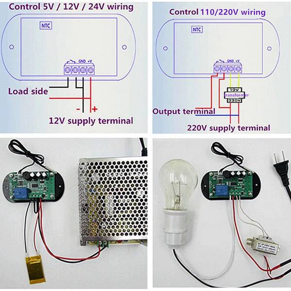 Connect DC/ AC12V power and the load Setting the desires temp: 1. Press the SET button, the LED flash the temperature 2. Press +- button to change the temperature value 3. Press SET to save and exit after setting successfully, or no operation 10s, temp save and exit