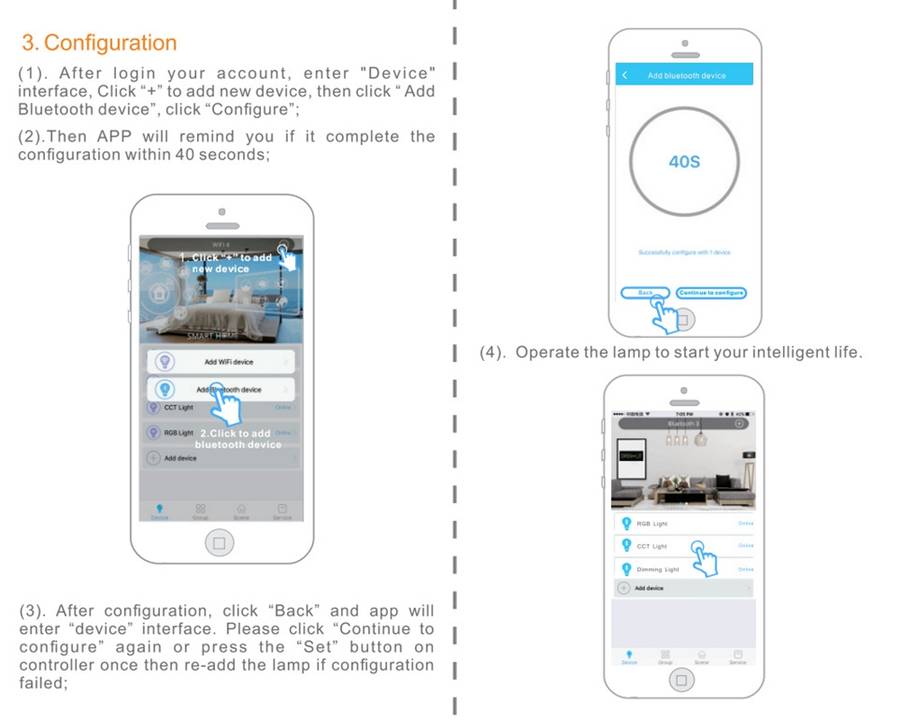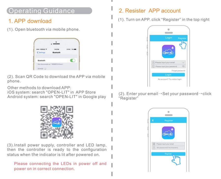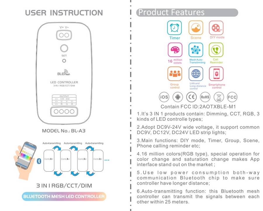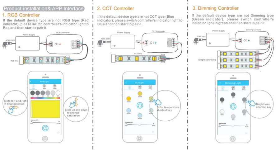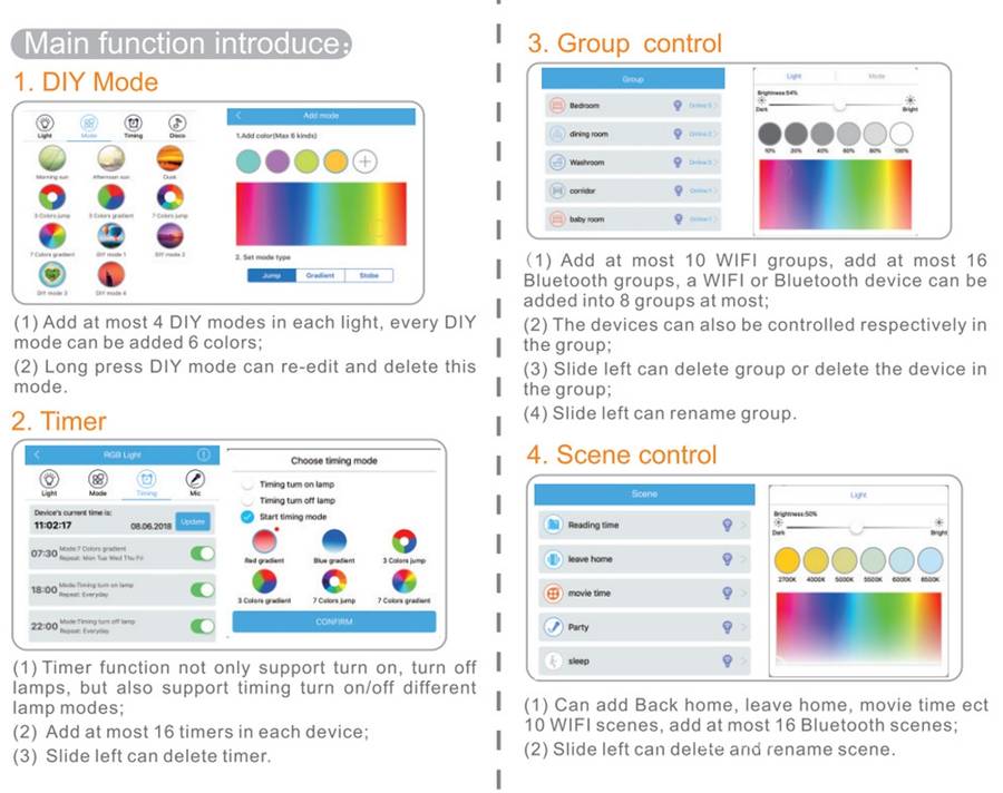 Feature: Dimming, CCT, RGB, 3 kinds of led controller types. Main functions: DIY mode, timer, group, scene, etc. 16 million colors,special operation for color change and saturation change makes app interface stand out on the market Use low power consumption both-way communication bluetooth chip to make sure controller have longer distance. Package included: 1 x Wifi strip controller 1 x manual
