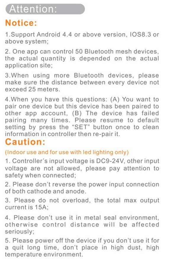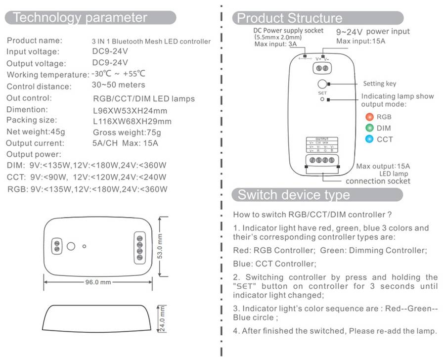 Specification: Input voltage: DC9V-24V Output voltage: DC9-24V Max output power: DIM: 9V:<135W, 12V:<180W, 24V:<360W RGB: 9V:<135W, 12V:<180W, 24V:<360W CCT: 9V:<90W, 12V:<120W, 24V:<240W Static power consumption: <1W Out max current: 5A/CH Total out current: 15 A Working temperature: -30a-55a Out Control:RGB/CCT/Dimmer strip lights (setting key to choice) Connecting mode: common anode Control distance: 30-50 meters Dimension:L116XW68XH29mm DC connector size: 5.5*2.1mm