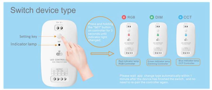 Specification: Input voltage: DC9V-24V Output voltage: DC9-24V Max output power: DIM:9V:<135W,12V:<180W,24V:<360W RGB: 9V:<135W,12V:<180W,24V:<360W CCT:9V:<90W,12V:<120W,24V:<240W Static power consumption: <1W Out max current:5A/CH Total out current:15 A Out Control:RGB/CCT/Dimmer strip lights (setting key tochoice) Connecting mode: common anode Control distance: 30-50 meters Dimension:L96XW53XH24mm