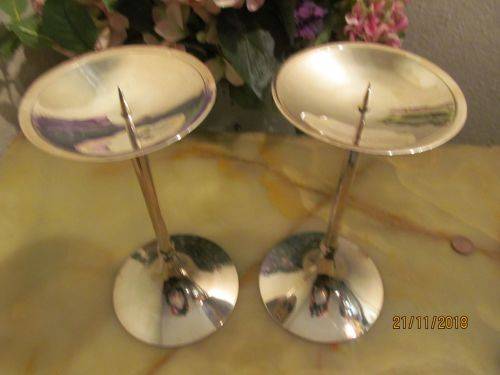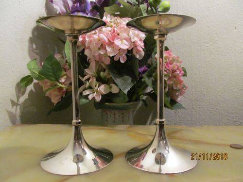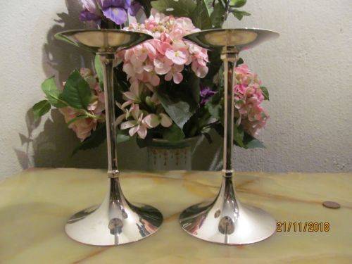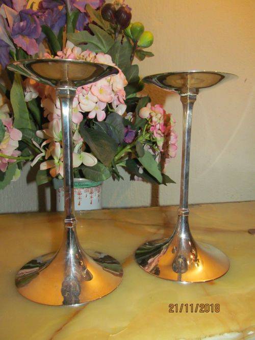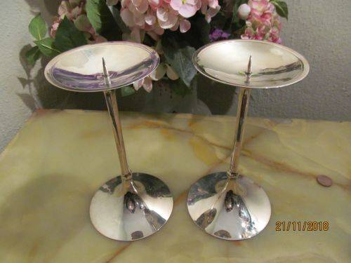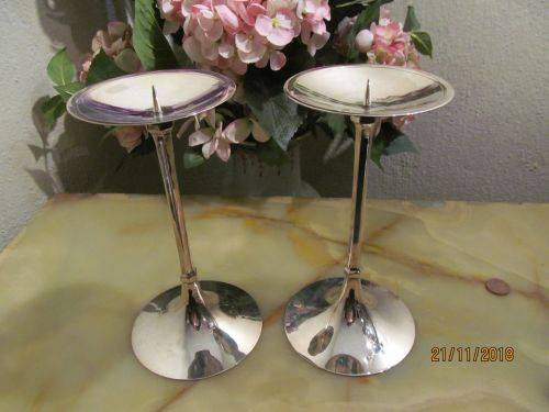 AN IDENTICAL PAIR OF SILVER PLATED PILLAR CANDLE STANDS DESIGNED AND MANUFACTURED WITH AN ART DECO AS WELL AS MODERNIST STYLE APPEAL. EACH HAS A TRUMPET SHAPED BASE WITH A HEXAGON SHAPED STEM TO WHICH A PROMINENT DRIP TRAY IS ATTACHED ALONG WITH A STURDY AND SOLIDLY DESIGNED PIN FOR CANDLE ATTACHMENT