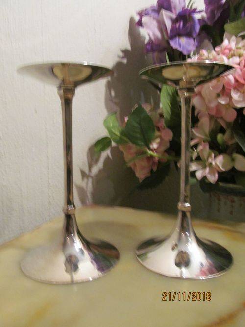 VINTAGE PAIR OF DECORATIVE SILVER PLATED PILLAR CANDLE STANDS - ART DECO / MODERNIST